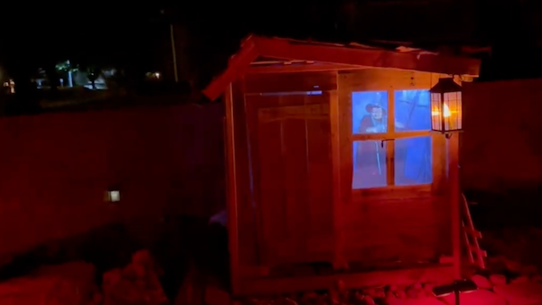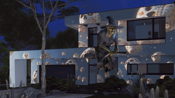 We start with the amazing outdoor display created by Nick B. at his home in Rancho Mission Viejo, California. As many of you know, we love single-theme decoration displays, and Nick’s Jurassic Park–focused Halloween display fits the bill perfectly.Nick uses his two-car garage door in the best way possible: Covering the entire opening with projection material, and then back-projecting Dinosaur Encounter onto it, big and bold. (The only way to project dinosaurs!)