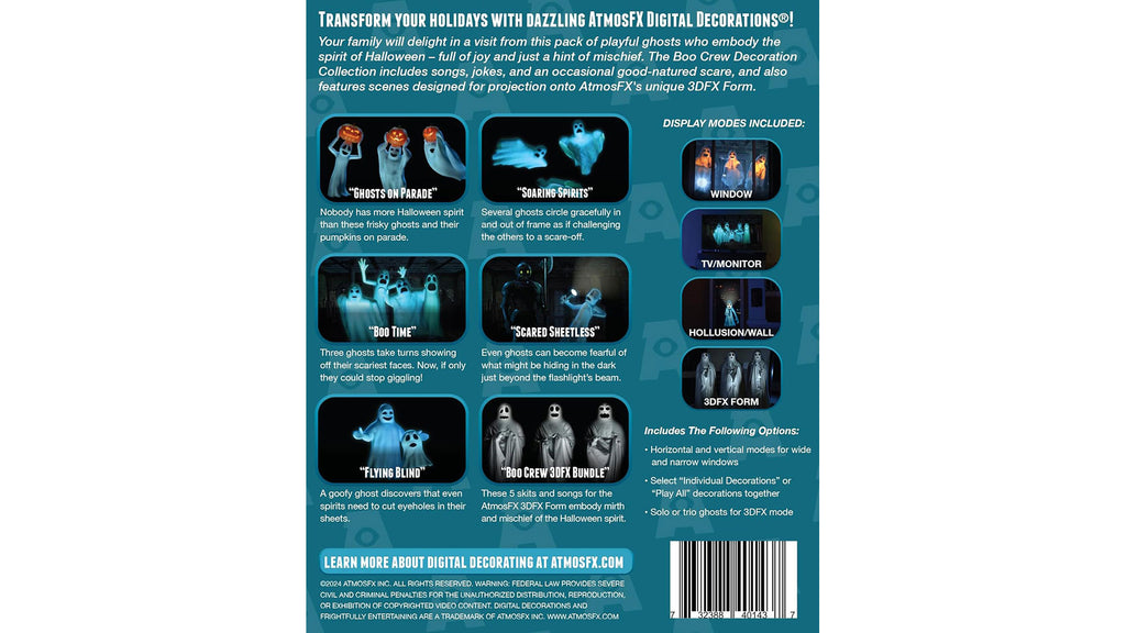 Your family will enjoy a visit from three playful ghosts who have materialized at your home. The Boo Crew Decoration Collection is full of songs, jokes and an occasional good-natured scare. These spirited spirits are the embodiment of Halloween – full of joy and with just a hint of mischief. This collection also features scenes made for projection onto AtmosFX's unique 3DFX Forms.