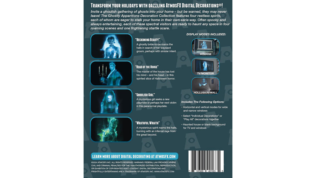 Invite a ghoulish gathering of ghosts into your home – but be warned, they may never leave! The neighborhood gathering of trick-or-treaters may not leave either, once they see your Halloween display featuring the four restless spirits that make up the Ghostly Apparitions Decoration Collection. Often spooky and always entertaining, these spectral visitors will appear to walk through walls and hover in your home when displayed on windows and surfaces. TVs and tablets, too. And to create a truly unforgettable Halloween spectacle, project these strange spirits on Hollusion Projection Material to make it appear they are materializing out of thin air, indoors or out!