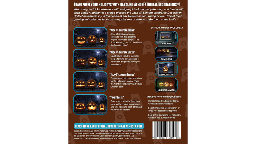 Welcome your trick-or-treaters with a high-spirited trio that joke, sing, and banter with each other. A guaranteed crowd-pleaser, the Jack-O'-Lantern Jamboree Decoration Collection inspires joy in the hearts of any Halloween fan, young or old. Project their glowing, mischievous faces on pumpkins real or fake to make them come to life. Or project the full pumpkin party on walls, windows, or play on TVs/Monitors to create the Halloween decoration display of your wildest imagination.