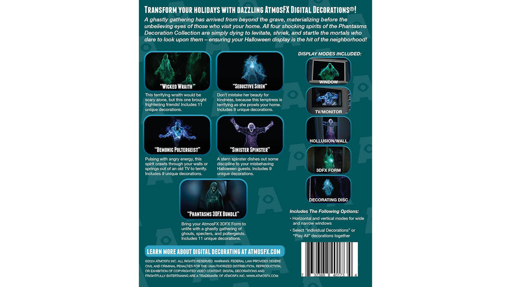A ghastly gathering of ghouls, specters, and poltergeists has arrived from beyond the grave, materializing before the unbelieving eyes of those who visit your home. All four of the shocking spirits of Phantasms Decoration Collection are simply dying to levitate, shriek, and startle the mortals who dare to look upon them – ensuring your Halloween display becomes the hit of the neighborhood! A must-have for those who want to create holographic-like illusions on Hollusion Projection Material, this decoration is also stunning on windows, walls and TVs. Phantasms also features additional display modes optimized for unique formats – like AtmosFX’s 3DFX Form and the Decorating Disc XL.