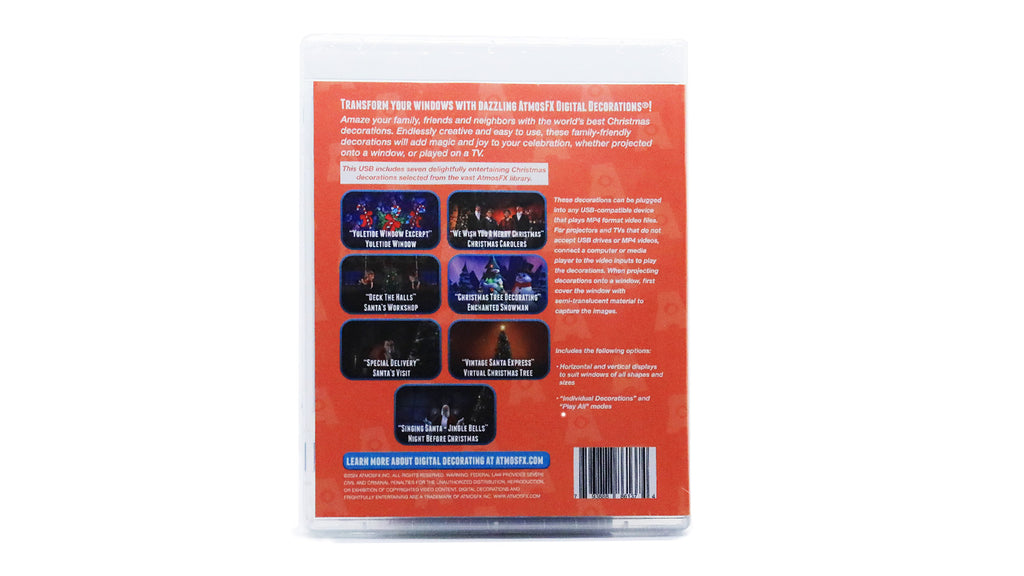 AtmosFX Christmas Window Decorations Vol. 1. contains 7 of AtmosFX's most dazzling displays for your festive holiday season. Each decoration is specially designed for for windows, which also look great on walls, televisions, and other screens too!