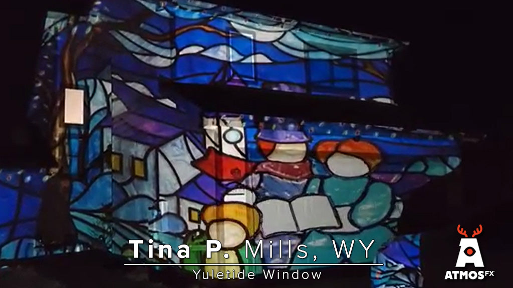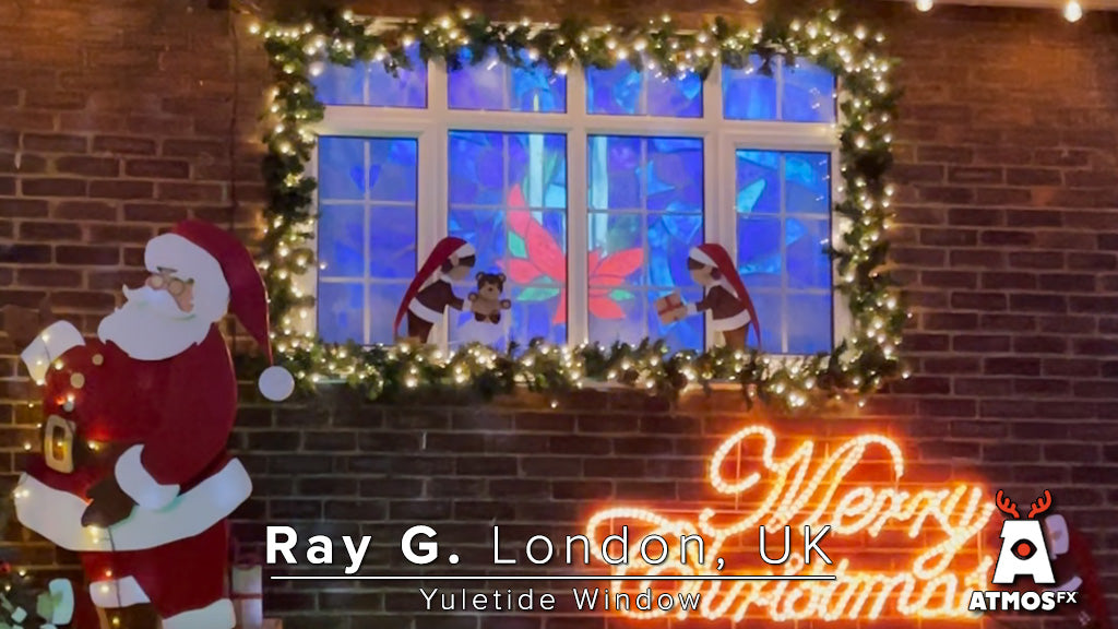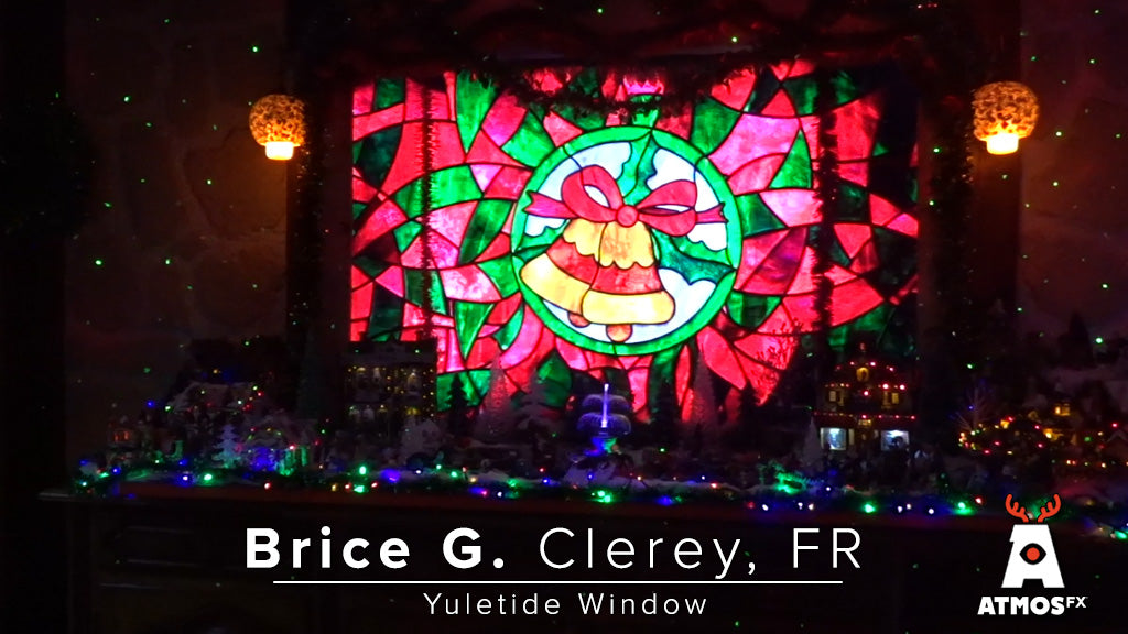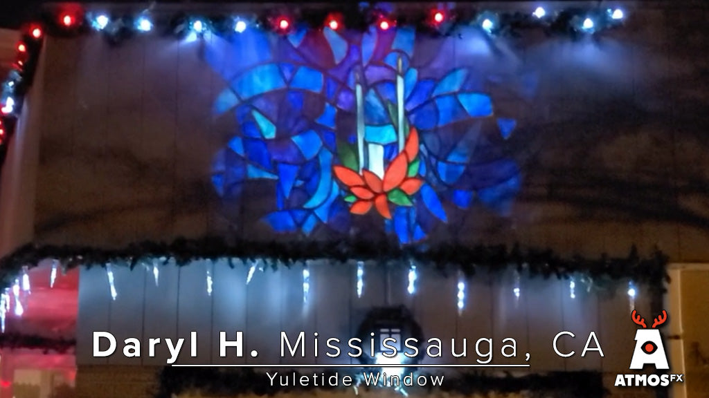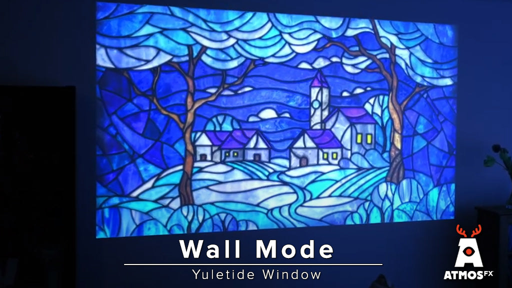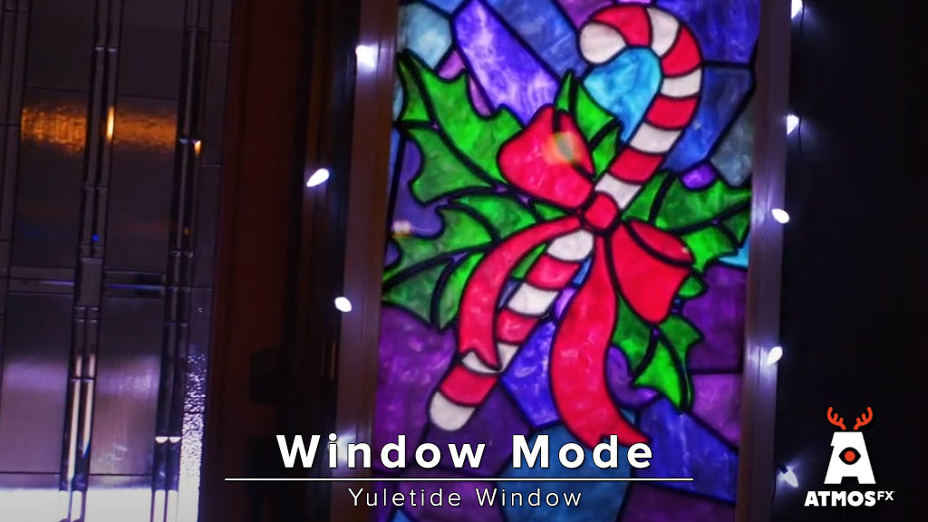 Few things better warm the winter light than the sun’s rays refracted through colorful stained glass. Create that same warmth at your home for your friends and family with the Yuletide Window Decoration, a radiant collection of holiday images, including Santa Claus, candy canes, holiday wreaths, and more. Rendered in both horizontal and vertical aspects, this colorful collection is perfect for projecting on windows and displaying on television screens. Or project onto the portable AtmosFX Decorating Disc XL for a stunning circular “window” you can hang anywhere. This beautiful single-scene decoration adds color and joy that can only be found during the Christmas season.